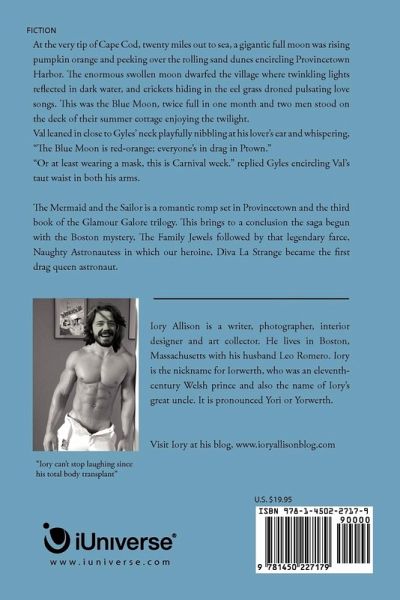 At the very tip of Cape Cod, twenty miles out to sea, a gigantic full moon was rising pumpkin orange and peeking over the rolling sand dunes encircling Provincetown Harbor. The enormous swollen moon dwarfed the village where twinkling lights reflected in dark water, and crickets hiding in the eel grass droned pulsating love songs. This was the Blue Moon, twice full in one month and two men stood on the deck of their summer cottage enjoying the twilight. Val leaned in close to Gyles¿ neck playfully nibbling at his lover¿s ear and whispering, ¿The Blue Moon is red-orange; everyone¿s in drag in Ptown.¿ ¿Or at least wearing a mask, this is Carnival week.¿ replied Gyles encircling Val¿s taut waist in both his arms. ????? The Mermaid and the Sailor is a romantic romp set in Provincetown and the third book of the Glamour Galore trilogy. This brings to a conclusion the saga begun with the Boston mystery, The Family Jewels followed by that legendary farce, Naughty Astronautess in which our heroine, Diva La Strange became the first drag queen astronaut.