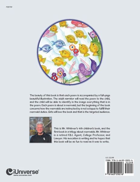 The beauty of this book is that each poem is accompanied by a full-page beautiful illustration. The adult narrator will read the poem to the child, and the child will be able to identify in the image everything that is in the poem. Each poem is about a mermaid, but the beginning of the book concerns how the mermaids are instructed by a red octopus to fulfill their mermaid duties. Girls will love the book and that is the targeted audience.