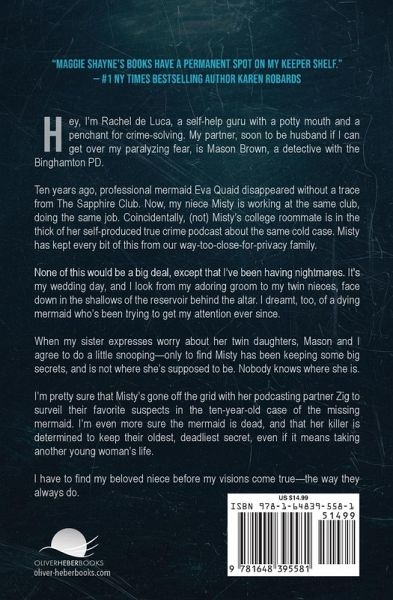 "Maggie Shayne's books have a permanent spot on my keeper shelf." -#1 NY Times Bestselling Author KAREN ROBARD Hey, I'm Rachel de Luca, a self-help guru with a potty mouth and a penchant for crime-solving. My partner, soon to be husband if I can get over my paralyzing fear, is Mason Brown, a detective with the Binghamton PD. Ten years ago, professional mermaid Eva Quaid disappeared without a trace from The Sapphire Club. Now, my niece Misty is working at the same club, doing the same job. Coincidentally, (not) Misty's college roommate is in the thick of her self-produced true crime podcast about the same cold case. Misty has kept every bit of this from our way-too-close-for-privacy family. None of this would be a big deal, except that I've been having nightmares. It's my wedding day, and I look from my adoring groom to my twin nieces, face down in the shallows of the reservoir behind the altar. I dreamt, too, of a dying mermaid who's been trying to get my attention ever since. When my sister Sandra says she's worried about twin daughters, Mason and I agree to do a little snooping-only to find Misty has been keeping some big secrets, and is not where she's supposed to be. Nobody knows where she is. I'm pretty sure that Misty's gone off the grid with her podcasting partner Zig to surveil their favorite suspects in the ten-year-old case of the missing mermaid. I'm even more sure the mermaid is dead, and that her killer is determined to keep their oldest, deadliest secret, even if it means taking another young woman's life. I have to find my beloved niece before my visions come true-the way they always do.
