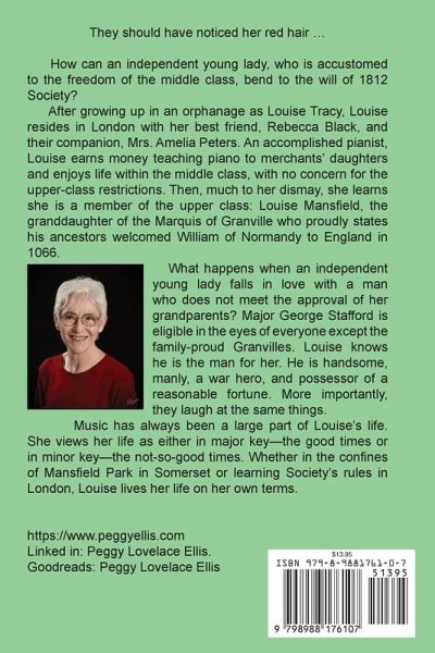 : They should have noticed her red hair .... How can an independent young lady, who is accustomed to the freedom of the middle class, bend to the will of 1812 Society? After growing up in an orphanage as Louise Tracy, Louise resides in London with her best friend, Rebecca Black, and their companion, Mrs. Amelia Peters. An accomplished pianist, Louise earns money teaching piano to merchants' daughters and enjoys life within the middle class, with no concern for the upper-class restrictions. Then, much to her dismay, she learns she is a member of the upper class: Louise Mansfield, the granddaughter of the Marquis of Granville who proudly states his ancestors welcomed William of Normandy to England in 1066. What happens when an independent young lady falls in love with a man who does not meet the approval of her grandparents? Major George Stafford is eligible in the eyes of everyone except the family-proud Granvilles. Louise knows he is the man for her. He is handsome, manly, a war hero, and possessor of a reasonable fortune. More importantly, they laugh at the same things. Music has always been a large part of Louise's life. She views her life as either in major key-the good times or in minor key-the not-so-good times. Whether in the confines of Mansfield Park in Somerset or learning Society's rules in London, Louise lives her life on her own terms.