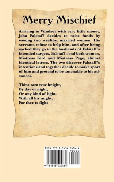 Merry Mischief-- Arriving in Windsor with very little money, John Falstaff decides to raise funds by wooing two wealthy, married women. His servants refuse to help him, and after being sacked they go to the husbands of Falstaff's intended targets. Falstaff send both women, Mistress Ford and Mistress Page, almost identical letters. The two discover Falstaff's intentions and together decide to make sport of him and pretend to be amenable to his advances.