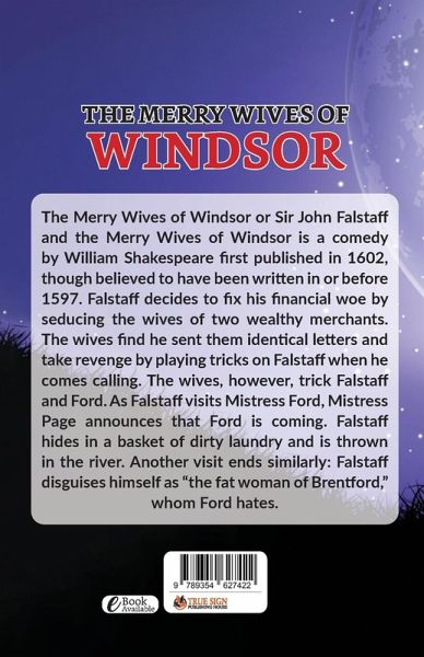 The Merry Wives of Windsor or Sir John Falstaff and the Merry Wives of Windsor is a comedy by William Shakespeare first published in 1602, though believed to have been written in or before 1597. Falstaff decides to fix his financial woe by seducing the wives of two wealthy merchants. The wives find he sent them identical letters and take revenge by playing tricks on Falstaff when he comes calling. The wives, however, trick Falstaff and Ford. As Falstaff visits Mistress Ford, Mistress Page announces that Ford is coming. Falstaff hides in a basket of dirty laundry and is thrown in the river. Another visit ends similarly: Falstaff disguises himself as "the fat woman of Brentford," whom Ford hates.