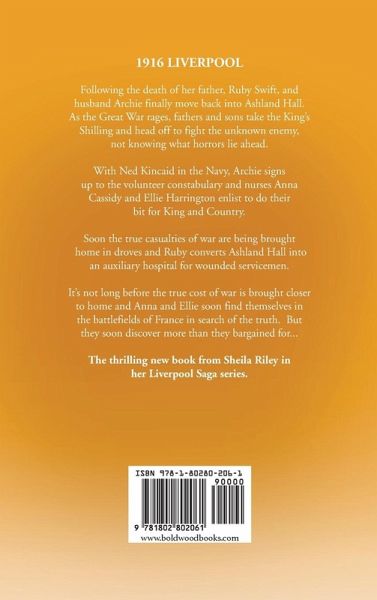 The thrilling new book from Sheila Riley in her Liverpool Saga series 1916 LIVERPOOL Following the death of her father, Ruby Swift, and husband Archie finally move back into Ashland Hall. As the Great War rages, fathers and sons take the King's Shilling and head off to fight the unknown enemy, not knowing what horrors lie ahead. With Ned Kincaid in the Navy, Archie signs up to the volunteer constabulary and nurses Anna Cassidy and Ellie Harrington enlist to do their bit for King and Country. Soon the true casualties of war are being brought home in droves, Ruby converts Ashland Hall into an auxiliary hospital for wounded servicemen. It's not long before the true cost of war is brought closer to home and Anna and Ellie enlist in the British Military Nursing Corp and soon find themselves in the battlefields of France in search of the truth. But they soon discover more than they bargained for...