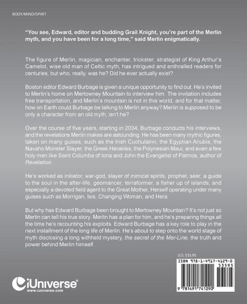 "You see, Edward, editor and budding Grail Knight, you're part of the Merlin myth, and you have been for a long time," said Merlin enigmatically. The figure of Merlin, magician, enchanter, trickster, strategist of King Arthur's Camelot, wise old man of Celtic myth, has intrigued and enthralled readers for centuries, but who, really, was he? Did he ever actually exist? Boston editor Edward Burbage is given a unique opportunity to find out. He's invited to Merlin's home on Mertowney Mountain to interview him. The invitation includes free transportation, and Merlin's mountain is not in this world, and for that matter, how on Earth could Burbage be talking to Merlin anyway? Merlin is supposed to be only a character from an old myth, isn't he? Over the course of five years, starting in 2034, Burbage conducts his interviews, and the revelations Merlin makes are astounding. He has been many mythic figures, taken on many guises, such as the Irish Cuchulainn, the Egyptian Anubis, the Navaho Monster Slayer, the Greek Herakles, the Polynesian Maui, and even a few holy men like Saint Columba of Iona and John the Evangelist of Patmos, author of Revelation. He's worked as initiator, war-god, slayer of inimical spirits, prophet, seer, a guide to the soul in the after-life, geomancer, terraformer, a fisher up of islands, and especially a devoted field agent to the Great Mother, Herself operating under many guises such as Morrigan, Isis, Changing Woman, and Hera. But why has Edward Burbage been brought to Mertowney Mountain? It's not just so Merlin can tell his true story. Merlin has a plan for him, and he's preparing things all the time he's recounting his exploits. Edward Burbage has a key role to play in the next installment of the long life of Merlin. He's about to step onto the world stage of myth disclosing a long withheld mystery, the secret of the Mer-Line, the truth and power behind Merlin himself.