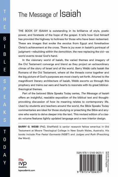 The book of Isaiah is outstanding in its brilliance of style, poetic power, and foretaste of the hope of the gospel. It tells how God himself has provided the highway to holiness for those who have been redeemed. These are images that evoke the exodus from Egypt and foreshadow Christ's achievement at the cross. There is joy even in Isaiah's portrayal of judgment--rebuilding within the demolition, the new replacing the old--as world events reveal God's hand. In the visionary world of Isaiah, the varied themes and imagery of the Old Testament converge and blend as they project an extraordinary climax of the story of Israel and of the world. Barry Webb calls Isaiah the Romans of the Old Testament, where all the threads come together and the big picture of God's purposes are most clearly set forth. Attuned to the magnificent literary architecture of Isaiah, Webb escorts us through this prophecy and trains our ears and hearts to resonate with its great biblical-theological themes. Part of the beloved Bible Speaks Today series, The Message of Isaiah offers an insightful, readable exposition of the biblical text and thought-provoking discussion of how its meaning relates to contemporary life. Used by students and teachers around the world, the Bible Speaks Today commentaries are ideal for those studying or preaching the Bible and anyone who wants to delve deeper into the text. This revised edition of a classic volume features lightly updated language and a new interior design.