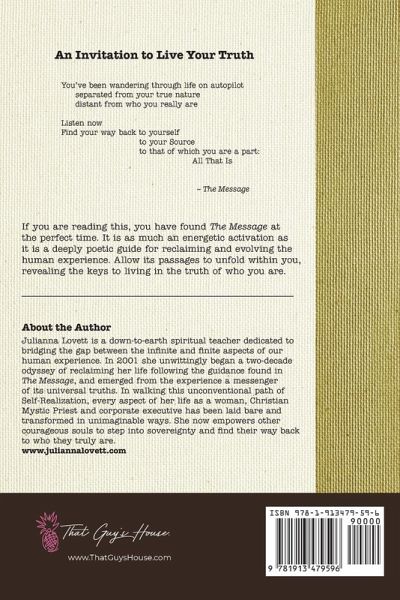 Julianna Lovett is a down-to-earth spiritual teacher dedicated to bridging the gap between the infinite and finite aspects of our human experience. In 2001 she unwittingly began a two-decade odyssey of reclaiming her life following the guidance found in The Message, and emerged from the experience a messenger of its universal truths. In walking this unconventional path of Self-Realization, every aspect of her life as a woman, Christian Mystic Priest and corporate executive has been laid bare and transformed in unimaginable ways. She now empowers other courageous souls to step into sovereignty and find their way back to who they truly are. www.juliannalovett.com