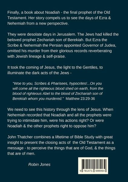 Finally, a book about Noadiah - the final prophet of the Old Testament. Her story compels us to see the days of Ezra and Nehemiah from a new perspective. They were desolate days in Jerusalem. The Jews had killed the beloved prophet Zechariah son of Berekiah, but Ezra the scribe and Nehemiah the Persian appointed Governor of Judea, omitted his murder from their glorious records reverberating with Jewish lineage and self-praise. It took the coming of Jesus, the light to the Gentiles, to illuminate the dark acts of the Jews - "Woe to you, Scribes and Pharisees, you hypocrites! You build tombs for the prophets and decorate the monuments of the righteous. And you say, 'If we had lived in the days of our fathers, we would not have been partners with them in shedding the blood of the prophets.'...upon you will come all the righteous blood shed on earth, from the blood of righteous Abel to the blood of Zechariah son of Berekiah, whom you murdered between the temple and the altar." Matthew 23:29-35 Stephen also said of the Jews - Was there ever a prophet your ancestors did not persecute? We need to see the history of the Jews through the lens of Jesus. When Nehemiah recorded that Noadiah and all the prophets were trying to intimidate him, were his actions right, or was it Noadiah and the other prophets who were right to oppose him? John Thatcher combines a lifetime of Bible study with great insight, to present the closing acts of the Old Testament as a warning to perceive the things that are of God, and the things that are of men.