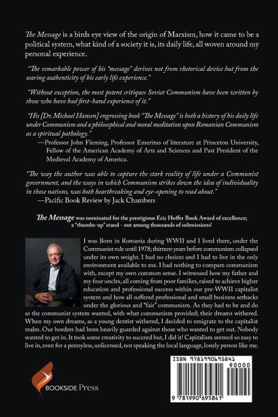 The Message is a birds eye view of the origin of Marxism, how it came to be a political system, what kind of a society it is, its daily life, all woven around my personal experience. "The remarkable power of his "message" derives not from rhetorical device but from the searing authenticity of his early life experience." "Without exception, the most potent critiques Soviet Communism have been written by those who have had first-hand experience of it." "His [Dr, Michael Hansen] engrossing book "The Message" is both a history of his daily life under Communism and a philosophical and moral meditation upon Romanian Communism as a spiritual pathology."-Professor John Fleming, Professor Emeritus of literature at Princeton University, Fellow of the American Academy of Arts and Sciences and Past President of the Medieval Academy of America. "The way the author was able to capture the stark reality of life under a Communist government, and the ways in which Communism strikes down the idea of individuality in those nations, was both heartbreaking and eye-opening to read about."-Pacific Book Review by Jack Chambers