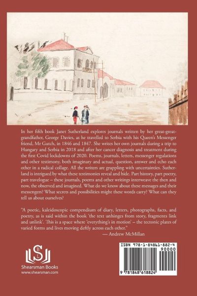 In her fifth book, Janet Sutherland explores journals written by her great-great-grandfather, George Davies, as he travelled to Serbia with his Queen's Messenger friend, Mr Gutch, in 1846 and 1847. She writes her own journals during a trip to Hungary and Serbia in 2018 and after her cancer diagnosis and treatment during the first Covid lockdowns of 2020. Poems, journals, letters, messenger regulations and other testimony, both imaginary and actual, question, answer and echo each other in a radical collage. All the writers are grappling with uncertainties. Sutherland is intrigued by what these testimonies reveal and hide. Part history, part poetry, part travelogue - these journals, poems and other writings interweave the then and now, the observed and imagined. What do we know about these messages and their messengers? What secrets and possibilities might these words carry? What can they tell us about ourselves? Andrew McMillan writes: "A poetic, kaleidoscopic compendium of diary, letters, photographs, facts, and poetry, as is said within the book "the text unhinges from story, fragments link and unlink". This is a space where 'everything's in motion' - the tectonic plates of varied forms and lives moving deftly across each other."