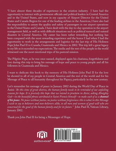 The Pilgrim Pope, as he was once named, displayed again his charisma, forgetfulness and love during this last trip to Canada, Central America and Mexico, to bring his message of hope and peace to young people and all his followers who greeted him with joy, love and hope in 2002. This book is dedicated to the memory of His Holiness John Paul II for the love he showed to all of his people in Central America and the rest of the world and for his Message of Peace to all humanity throughout his Papacy, particularly in the new century. Let's remember his message of peace in January 2002 during the World Day of Peace in Assisi: "At this time of great distress, the human family needs to be reminded of our unfailing reasons for hope. It is precisely this hope that we intend to proclaim in Assisi, asking Almighty God-in the beautiful phrase attributed to Saint Francis himself-to make each of us a channel of his peace. No peace without justice, no justice without forgiveness: this is what in this Message I wish to say to believers and non-believers alike, to all men and women of good will who are concerned for the good of the human family and for its future." John Paul II, Vatican Library, January 2002. Thank you John Paul II for being a Messenger of Hope.