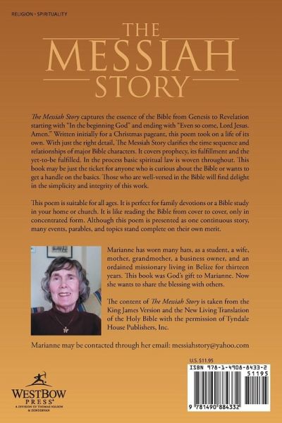 The Messiah Story captures the essence of the Bible from Genesis to Revelation starting with "In the beginning God" and ending with "Even so come, Lord Jesus. Amen." Written initially for a Christmas pageant, this poem took on a life of its own. With just the right detail, The Messiah Story clarifies the time sequence and relationships of major Bible characters. It covers prophecy, its fulfillment and the yet-to-be fulfilled. In the process basic spiritual law is woven throughout. This book may be just the ticket for anyone who is curious about the Bible or wants to get a handle on the basics. Those who are well-versed in the Bible will find delight in the simplicity and integrity of this work. This poem is suitable for all ages. It is perfect for family devotions or a Bible study in your home or church. It is like reading the Bible from cover to cover, only in concentrated form. Although this poem is presented as one continuous story, many events, parables, and topics stand complete on their own merit.