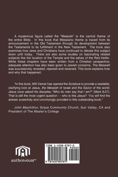 A mysterious figure called the "Messiah" is the central theme of the entire Bible. In this book that Messianic theme is traced from its announcement in the Old Testament through its development between the Testaments to its fulfillment in the New Testament. The book also examines how Jews and Christians have continued to debate this subject down until today. There are also some studies on fascinating related subjects like the location of the Temple and the ashes of the Red Heifer. While these chapters have been written from a Christian perspective, adequate attention has also been given to Jewish concerns. The Messiah was successively revealed, rejected and received. This book explains how and why that happened. "In this book, Will Varner has opened the Scripture to provide a readable, clarifying look at Jesus, the Messiah of Israel and the Savior of the world. Jesus once asked His disciples, "Who do men say that I am?" (Mark 8:27). That is still the most urgent question - - who is this Jesus? You will find the answer powerfully and convincingly provided in this outstanding book." John MacArthur, Grace Community Church, Sun Valley, CA and President of The Master's College