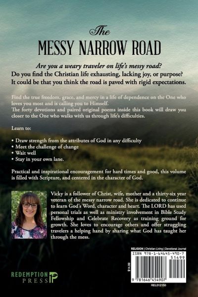 Are you a weary traveler on life's messy road? Do you find the Christian life exhausting, lacking joy, or purpose? It could be that you think the road is paved with rigid expectations. Find the true freedom, grace, and mercy in a life of dependence on the One who loves you most and is calling you to Himself. The forty devotions and paired original poems inside this book will draw you closer to the One who walks with us through life's difficulties. Learn to: Draw strength from the attributes of God in any difficulty Meet the challenge of change Wait well Stay in your own lane. Practical and inspirational encouragement for hard times and good, this volume is filled with Scripture, and centered in the character of God. Vicky is a follower of Christ, wife, mother and a thirty-five year veteran of the messy narrow road. She is dedicated to continue learning God's Word, character and heart. The LORD has used personal trials as well as ministry involvement in Bible Study Fellowship and Celebrate Recovery as training ground for growth.¿She loves to encourage others and offer struggling travelers a helping hand by sharing what God has taught her through the mess.