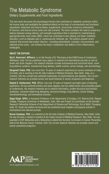 1. An Overview of Metabolic Syndrome 2. Role of Microbes as Natural Antioxidants of Pharmaceutical Importance 3. Role of Bioactive Compounds in Metabolic Syndrome 4. Preventive Measures of Type 2 Diabetes via Nutrition 5. Potentials of Trace Elements and Vitamins in Management of Oxidative Stress Linked Diabetes 6. Gut Microbiome and Metabolic Syndrome 7. Role of Dietary in Prevention and Management of Obesity 8. Effect of Phenolic Compound in Plants for the Treatment of Type II Diabetes 9. Role of Vitamins in Metabolic Syndrome 10. Pathophysiology and Application of Herbs in Metabolic Syndrome 11. Metabolic Syndrome: A Concerning Area for Future Research 12. Beneficial Effect of Dietary Supplements in Metabolic Induced Obesity 13. Nutraceuticals in the Prevention and Management of Type II Diabetes 14. Effect of Medicinal Plants in Metabolic Syndrome 15. Role of Plant-Based Bioactive Nutritional or Dietary Supplements in Metabolic Syndrome of Women and Children During Covid-19
