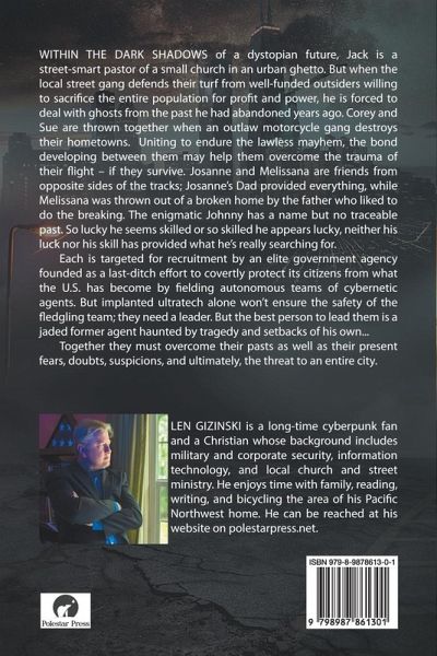 Within the dark shadows of a dystopian future, Jack is a street-smart pastor of a small church in an urban ghetto. But when the local street gang defends their turf from well-funded outsiders willing to sacrifice the entire population for profit and power, he is forced to deal with ghosts from the past he had abandoned years ago. Corey and Sue are thrown together when an outlaw motorcycle gang destroys their hometowns. Uniting to endure the lawless mayhem, the bond developing between them may help them overcome the trauma of their flight - if they survive. Josanne and Melissana are friends from opposite sides of the tracks; Josanne's Dad provided everything, while Melissana was thrown out of a broken home by the father who liked to do the breaking. The enigmatic Johnny has a name but no traceable past. So lucky he seems skilled or so skilled he appears lucky, neither his luck nor his skill has provided what he's really searching for. Each is targeted for recruitment by an elite government agency founded as a last-ditch effort to covertly protect its citizens from what the U.S. has become by fielding autonomous teams of cybernetic agents. But implanted ultratech alone won't ensure the safety of the fledgling team; they need a leader. But the best person to lead them is a jaded former agent haunted by tragedy and setbacks of his own... Together they must overcome their pasts as well as their present fears, doubts, suspicions, and ultimately, the threat to an entire city.