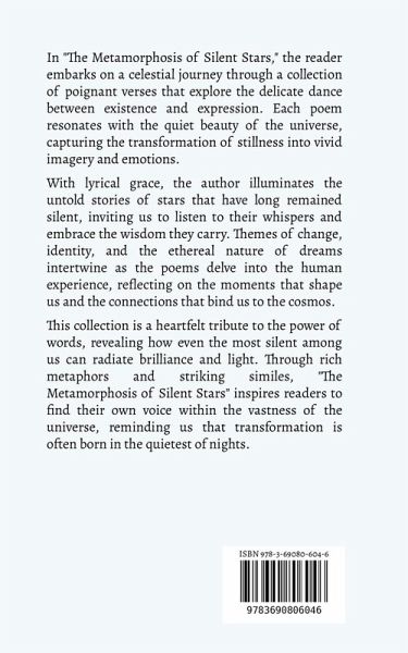 In "The Metamorphosis of Silent Stars," the reader embarks on a celestial journey through a collection of poignant verses that explore the delicate dance between existence and expression. Each poem resonates with the quiet beauty of the universe, capturing the transformation of stillness into vivid imagery and emotions. With lyrical grace, the author illuminates the untold stories of stars that have long remained silent, inviting us to listen to their whispers and embrace the wisdom they carry. Themes of change, identity, and the ethereal nature of dreams intertwine as the poems delve into the human experience, reflecting on the moments that shape us and the connections that bind us to the cosmos. This collection is a heartfelt tribute to the power of words, revealing how even the most silent among us can radiate brilliance and light. Through rich metaphors and striking similes, "The Metamorphosis of Silent Stars" inspires readers to find their own voice within the vastness of the universe, reminding us that transformation is often born in the quietest of nights.