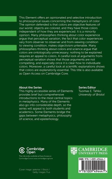This Element offers an opinionated and selective introduction to philosophical issues concerning the metaphysics of color. The opinion defended is that colors are objective features of our world; objects are colored, and they have those colors independent of how they are experienced. It is a minority opinion. Many philosophers thinking about color experience argue that perceptual variation, the fact that color experiences vary from observer to observer and from viewing condition to viewing condition, makes objectivism untenable. Many philosophers thinking about colors and science argue that colors are ontologically unnecessary; nothing to be explained requires an appeal to colors. A careful look at arguments from perceptual variation shows that those arguments are not compelling, and especially once it is clear how to individuate colors. Moreover, a careful look at scientific explanations shows that colors are explanatorily essential. This title is also available as Open Access on Cambridge Core.