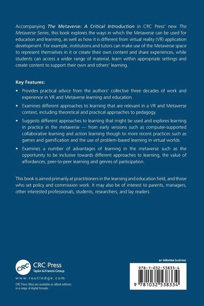 Accompanying The Metaverse: A Critical Introduction in CRC Press' new The Metaverse Series, this book explores the ways in which the Metaverse can be used for education and learning, as well as how it is different from virtual reality (VR) application development. For example, institutions and tutors can make use of the Metaverse space to represent themselves in it or create their own content and share experiences, whilst students can access a wider range of material, learn within appropriate settings and create content to support their own and others' learning.
