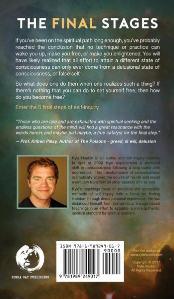 FOR THOSE IN THE FINAL STAGES OF AWAKENING Things become much more simplified at the end of the spiritual search... so much so that it's possible to identify key stages that every seeker encounters immediately preceding awakening (enlightenment). So in one sense, these 5 steps have not been invented by me, I have simply segmented the final stages that a seeker of truth encounters when they have reached the end of the spiritual search (for greater clarity and guidance). If you’ve been on the spiritual path long enough, you’ve probably reached the conclusion that no technique or practice can wake you up, make you free, or make you enlightened. You will have likely realized that all effort to attain a different state of consciousness can only ever come from a delusional state of consciousness, or false self. So what does one do then when one realizes such a thing? If there’s nothing that you can do to set yourself free, then how do you become free? Enter the 5 final steps of self-inquiry. The Method is based upon the understanding that spiritual awakening is not an attainment, but a dissolution. These 5 steps are intended to permanently dissolve the deeply ingrained belief that you can *make* yourself free. If these steps are followed through with utter totality, awakening will be what's left as a byproduct. While no methods 'work' when it comes to awakening, all methods fail... so in a way, any method can be helpful to exhaust the seeker in you. This method has been formed specifically for those who have tried every other method under the sun and are ready for defeat. This method is intended to be the last method. This is the end game my friend, are you ready? Feedback: "Those who are ripe and are exhausted with spiritual seeking and the endless questions of the mind, will find a great resonance with the words herein; and maybe, just maybe, a true catalyst for the final step." — Prof. Kriben Pillay, Author of The Poisons - greed, ill will, delusion Kyle Hoobin is an author and self-inquiry teacher. In April of 2002 Kyle experienced a profound shift in consciousness following a long battle with depression. He now offers support for those seeking authentic freedom in their lives. Kyle’s teachings focus on practical and accessible methods of self-inquiry with a focus on finding freedom through direct personal experience. He has distanced himself from conventional lineage based teachings in an effort to establish a more authentic spiritual standard for spiritual seekers. To learn more, visit kylehoobin.com and take part in Kyle’s bi-weekly live streams and his self-inquiry video series.