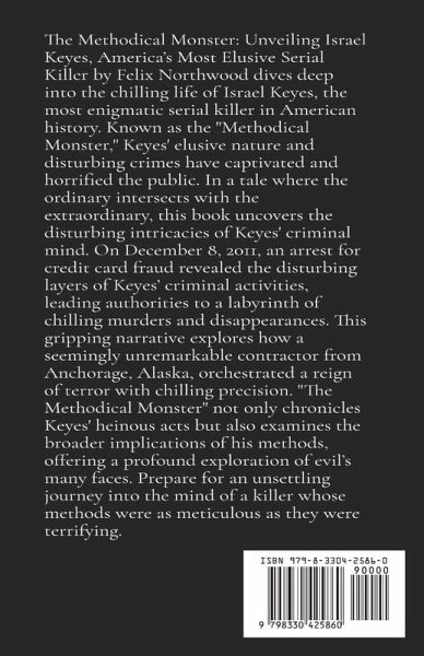 The Methodical Monster: Unveiling Israel Keyes, America's Most Elusive Serial Killer by Felix Northwood dives deep into the chilling life of Israel Keyes, the most enigmatic serial killer in American history. Known as the "Methodical Monster," Keyes' elusive nature and disturbing crimes have captivated and horrified the public. In a tale where the ordinary intersects with the extraordinary, this book uncovers the disturbing intricacies of Keyes' criminal mind. On December 8, 2011, an arrest for credit card fraud revealed the disturbing layers of Keyes' criminal activities, leading authorities to a labyrinth of chilling murders and disappearances. This gripping narrative explores how a seemingly unremarkable contractor from Anchorage, Alaska, orchestrated a reign of terror with chilling precision. "The Methodical Monster" not only chronicles Keyes' heinous acts but also examines the broader implications of his methods, offering a profound exploration of evil's many faces. Prepare for an unsettling journey into the mind of a killer whose methods were as meticulous as they were terrifying.