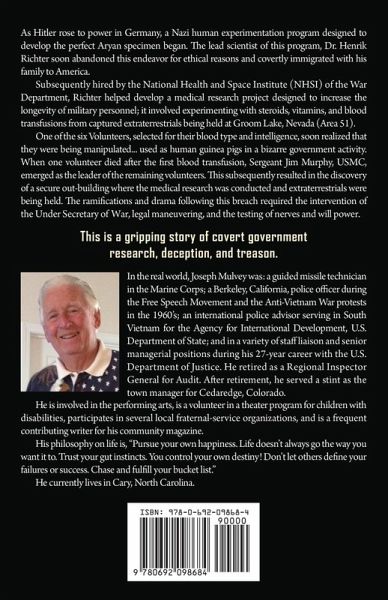 As Hitler rose to power in Germany, a Nazi human experimentation program designed to develop the perfect Aryan specimen began. The lead scientist of this program, Dr. Henrik Mueller soon abandoned this endeavor for ethical reasons and covertly immigrated with his family to America. Subsequently hired by the National Health and Space Institute (NHSI) of the War Department, Mueller helped develop a medical research project designed to increase the longevity of military personnel; it involved experimenting with steroids, vitamins, and blood transfusions from captured extraterrestrials being held at Groom Lake, Nevada (Area 51). One of the six Volunteers, selected for their blood type and intelligence, soon realized that they were being manipulated... used as human guinea pigs in a bizarre government activity. When one volunteer died after the first blood transfusion, Sergeant Jim Murphy, USMC, emerged as the leader of the remaining volunteers. This subsequently resulted in the discovery of a secure out-building where the medical research was conducted and extraterrestrials were being held. The ramifications and drama following this breach required the intervention of the under secretary of war, legal maneuvering, and the testing of nerves and will power. This is a gripping story of covert government research, deception, and treason.