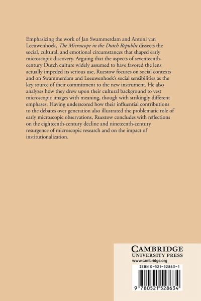 Focusing on the two seventeenth-century pioneers of microscopic discovery, the Dutchmen Jan Swammerdam and Antoni van Leeuwenhoek, the author demonstrates that their uneasiness with their social circumstances spurred their discoveries. Ruestow argues that while aspects of Dutch culture impeded serious research with the microscope, the contemporary culture shaped how Swammerdam and Leeuwenhoek responded to what they saw through the lens. For those interested in the history of science, this book considers the impact of institutionalization on microscopic research, and dissects the cultural, social and emotional circumstances that shaped early microscopic discovery.