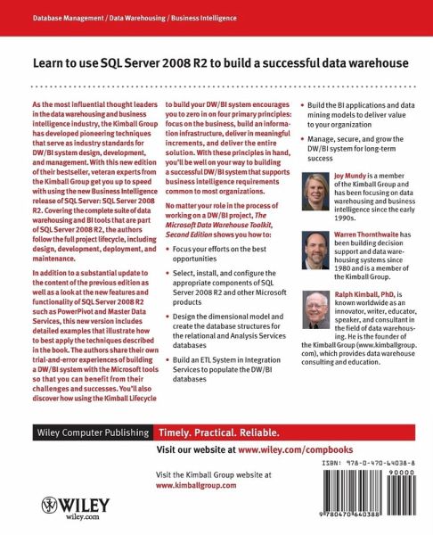 In this book, leading data warehouse experts from the Kimball Group share best practices for using the upcoming "Business Intelligence release" of SQL Server, referred to as SQL Server 2008 R2. In this new edition, the authors explain how SQL Server 2008 R2 provides a collection of powerful new tools that extend the power of its BI toolset to Excel and SharePoint users and they show how to use SQL Server to build a successful data warehouse that supports the business intelligence requirements that are common to most organizations. Covering the complete suite of data warehousing and BI tools that are part of SQL Server 2008 R2, as well as Microsoft Office, the authors walk you through a full project lifecycle, including design, development, deployment and maintenance.
