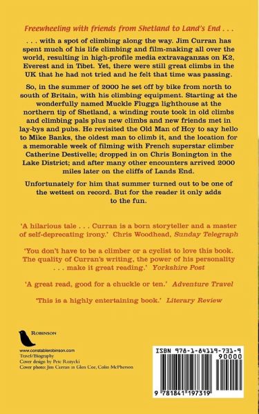 Jim Curran has spent a considerable part of his life climbing and film-making on mountains all over the world. His first love, domestic rock climbing, has been the basis for high-profile media extravaganzas on K2, Everest and in Tibet. Yet, he realised, there remained many of the great climbs in the UK that he had still not achieved. So, in the summer of 2000 he set off to cycle from north to south of Britain to make good this deficiency, carrying all his equipment with him. Not for him the standard John O'Groats to Land's End by the shortest route. He chose to start in sight of the wonderfully named Muckle Flugga lighthouse at the northerly tip of Shetland, and from there a winding route took in old climbs and climbing friends plus new climbs and new friends met in lay-bys and pubs. He revisited the Old Man of Hoy to meet Mike Banks, the oldest man to climb it, and the location for a memorable week of filming with French superstar climber Catherine Destivelle; dropped in on Chris Bonington in the Lake District; and arrived, 2000 miles later on the sea cliffs of Lands End where, with magazine editor Geoff Birtles, he managed the easiest and the nearest climb to New York. It was unfortunate for him that summer turned out to be one of the wettest on record. But for the reader it only adds to the fun of a wonderfully entertaining travelogue.