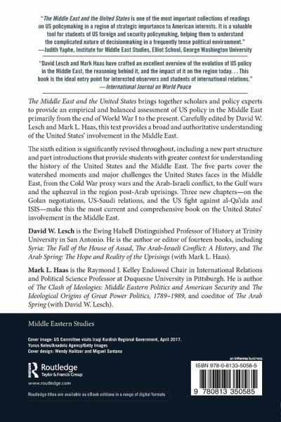 Introduction: How American Middle East Policy is Made, William B. Quandt Part I: The US Enters the Middle East 1. Americans and the Muslim World: First Encounters, Robert J. Allison 2. The Ironic Legacy of the King-Crane Commission, James Gelvin 3. US Foreign Policy Toward Iran During the Mussadiq Era, Mark Gasiorowski 4. National Security Concerns in US Policy Toward Egypt, 1949-1956, Peter Hahn Part II: Cold War Rivalries 5. The 1957 American-Syrian Crisis: Globalist Policy in a Regional Reality, David W. Lesch 6. The United States and Nasserist Pan-Arabism, Malik Mufti 7. The Soviet Perception of the US Threat, Georgiy Mirsky 8. The Superpowers and the Cold War in the Middle East, Rashid Khalidi Part III: Arab-Israeli War and Peace 9. The 1967 Arab-Israeli War: US Actions and Arab Perceptions, Fawaz A. Gerges 10. The Golan Negotiations: US-Syrian Relations and the Failure to Achieve a Comprehensive Peace, Andrew Bowen 11. From Madrid and Oslo to Camp David: The United States and the Arab-Israeli Conflict, 1991-2001, Jeremy Pressman 12. George W. Bush, Barack Obama, and the Arab-Israeli Conflict, Robert Freedman Part IV: The Persian Gulf in US Policy 13. The United States in the Persian Gulf: From Twin Pillars to Dual Containment, Gary Sick 14. The Iraq War of 2003: Why Did the United States Decide to Invade?, Steve A. Yetiv 15. What Went Wrong in Iraq?, Ali R. Abootlalebi 16. The United States and Saudi Arabia, Thomas Lippman Part V: US-Middle Eastern Relations after 9/11 17. Islamist Perceptions of US Policy in the Middle East, Yvonne Yasbeck-Haddad 18. Ideology and America's Nuclear Crisis with Iran, Mark L. Haas 19. The U.S.'s Post-9/11 Fight against al-Qaeda and the Islamic State: A Losing Effort in Search of a Change, Daveed Gartenstein-Ross 20. The Push and Pull of Strategic Cooperation: The US Relationship with Turkey in the Middle East, Henri J. Barkey 21. The Arab Uprisings from the US Perspective, Mark L. Haas Epilogue: The Early Years of the Trump Administration's Middle East Policy, David W. Lesch and Mark L. Haas