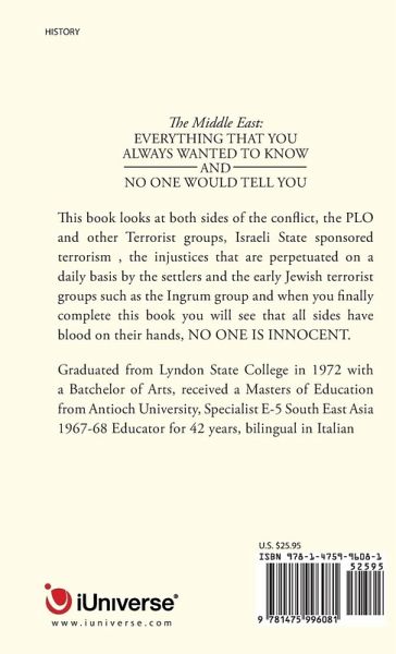 This book looks at both sides of the conflict, the PLO and other Terrorist groups, Israeli State sponsored terrorism , the injustices that are perpetuated on a daily basis by the settlers and the early Jewish terrorist groups such as the Ingrum group and when you finally complete this book you will see that all sides have blood on their hands, NO ONE IS INNOCENT.