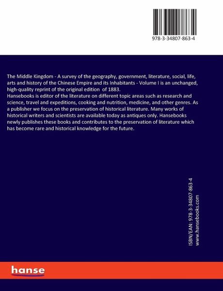 The Middle Kingdom - A survey of the geography, government, literature, social, life, arts and history of the Chinese Empire and its Inhabitants - Volume I is an unchanged, high-quality reprint of the original edition of 1883.Hansebooks is editor of the literature on different topic areas such as research and science, travel and expeditions, cooking and nutrition, medicine, and other genres. As a publisher we focus on the preservation of historical literature. Many works of historical writers and scientists are available today as antiques only. Hansebooks newly publishes these books and contributes to the preservation of literature which has become rare and historical knowledge for the future.