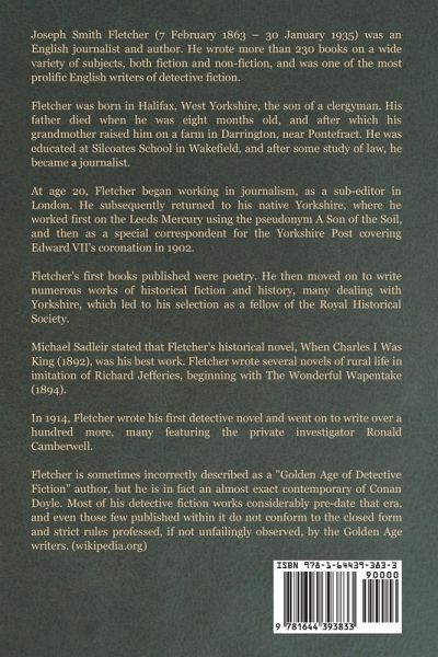 Joseph Smith Fletcher (7 February 1863 - 30 January 1935) was an English journalist and author. He wrote more than 230 books on a wide variety of subjects, both fiction and non-fiction, and was one of the most prolific English writers of detective fiction. Fletcher was born in Halifax, West Yorkshire, the son of a clergyman. His father died when he was eight months old, and after which his grandmother raised him on a farm in Darrington, near Pontefract. He was educated at Silcoates School in Wakefield, and after some study of law, he became a journalist. At age 20, Fletcher began working in journalism, as a sub-editor in London. He subsequently returned to his native Yorkshire, where he worked first on the Leeds Mercury using the pseudonym A Son of the Soil, and then as a special correspondent for the Yorkshire Post covering Edward VII's coronation in 1902. Fletcher's first books published were poetry. He then moved on to write numerous works of historical fiction and history, many dealing with Yorkshire, which led to his selection as a fellow of the Royal Historical Society. Michael Sadleir stated that Fletcher's historical novel, When Charles I Was King (1892), was his best work. Fletcher wrote several novels of rural life in imitation of Richard Jefferies, beginning with The Wonderful Wapentake (1894). In 1914, Fletcher wrote his first detective novel and went on to write over a hundred more, many featuring the private investigator Ronald Camberwell. Fletcher is sometimes incorrectly described as a "Golden Age of Detective Fiction" author, but he is in fact an almost exact contemporary of Conan Doyle. Most of his detective fiction works considerably pre-date that era, and even those few published within it do not conform to the closed form and strict rules professed, if not unfailingly observed, by the Golden Age writers. (wikipedia.org)