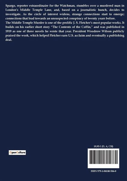 Spargo, reporter extraordinaire for the Watchman, stumbles over a murdered man in London¿s Middle Temple Lane, and, based on a journalistic hunch, decides to investigate. As the circle of interest widens, strange connections start to emerge; connections that lead towards an unsuspected conspiracy of twenty years before. The Middle Temple Murder is one of the prolific J. S. Fletcher¿s most popular works. It builds on his earlier short story ¿The Contents of the Coffin,¿ and was published in 1919 as one of three novels he wrote that year. President Woodrow Wilson publicly praised the work, which helped Fletcher earn U.S. acclaim and eventually a publishing deal.