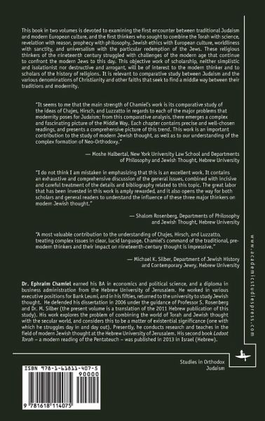 This book in two volumes is devoted to examining the first encounter between traditional Judaism and modern European culture, and the first thinkers who sought to combine the Torah with science, revelation with reason, prophecy with philosophy, Jewish ethics with European culture, worldliness with sanctity, and universalism with the particular redemption of the Jews. These religious thinkers of the nineteenth century struggled with challenges of the modern age that continue to confront the modern Jews to this day. This objective work of scholarship, neither simplistic and isolationist nor destructive and arrogant, will be of interest to the modern thinker and to scholars of the history of religions. It is relevant to comparative study between Judaism and the various denominations of Christianity and other faiths that seek to find a middle way between their traditions and modernity.