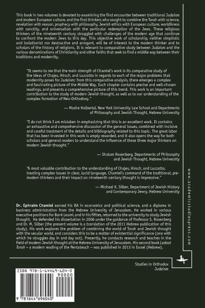 This book in two volumes is devoted to examining the first encounter between traditional Judaism and modern European culture, and the first thinkers who sought to combine the Torah with science, revelation with reason, prophecy with philosophy, Jewish ethics with European culture, worldliness with sanctity, and universalism with the particular redemption of the Jews. These religious thinkers of the nineteenth century struggled with challenges of the modern age that continue to confront the modern Jews to this day. This objective work of scholarship, neither simplistic and isolationist nor destructive and arrogant, will be of interest to the modern thinker and to scholars of the history of religions. It is relevant to comparative study between Judaism and the various denominations of Christianity and other faiths that seek to find a middle way between their traditions and modernity.