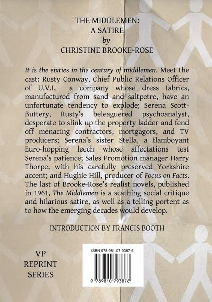 It is the sixties in the century of middlemen. Meet the cast: Rusty Conway, Chief Public Relations Officer of U.V.I, a company whose dress fabrics, manufactured from sand and saltpetre, have an unfortunate tendency to explode; Serena Scott-Buttery, Rusty's beleaguered psychoanalyst, desperate to slink up the property ladder and fend off menacing contractors, mortgagors, and TV producers; Serena's sister Stella, a flamboyant Euro-hopping leech whose affectations test Serena's patience; Sales Promotion manager Harry Thorpe, with his carefully preserved Yorkshire accent; and Hughie Hill, producer of Focus on Facts. The last of Brooke-Rose's realist novels, published in 1961, The Middlemen is a scathing social critique and hilarious satire, as well as a telling portent as to how the emerging decades would develop. Introduction by Francis Booth.