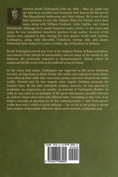 Newton Booth Tarkington (July 29, 1869 - May 19, 1946) was an American novelist and dramatist best known for his novels The Magnificent Ambersons and Alice Adams. He is one of only four novelists to win the Pulitzer Prize for Fiction more than once, along with William Faulkner, John Updike, and Colson Whitehead. Although he is nearly forgotten today (2020), in the 1910s and 1920s he was considered America's greatest living author. Several of his stories were adapted to film. During the first quarter of the 20th century, Tarkington, along with Meredith Nicholson, George Ade, and James Whitcomb Riley helped to create a Golden Age of literature in Indiana. Booth Tarkington served one term in the Indiana House of Representatives, was critical of the advent of automobiles, and set many of his stories in the Midwest. He eventually removed to Kennebunkport, Maine, where he continued his life work even as he suffered a loss of vision. In the 1910s and 1920s, Tarkington was regarded as the great American novelist, as important as Mark Twain. His works were reprinted many times, were often on best-seller lists, won many prizes, and were adapted into other media. Penrod and its two sequels were regular birthday presents for bookish boys. By the later twentieth century, however, he was ignored in academia: no congresses, no society, no journal of Tarkington Studies. In 1985 he was cited as an example of the great discrepancy possible between an author's fame when alive and oblivion later. According to this view, if an author succeeds at pleasing his or her contemporaries - and Tarkington's works have not a whiff of social criticism - he or she is not going to please later readers of inevitably different values and concerns. (wikipedia.org)