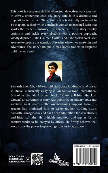 This book is a suspense thriller where four detectives work together to solve a mysterious case. The story unfolds in a dramatic and unpredictable manner. The entire fiction is skillfully portrayed in 14 chapters, each of which concludes with an unexpected twist that sparks the reader's curiosity. The characters in the story display optimism and tackle every obstacle with a positive approach, vividly depicted. "The Haunted Castle" and "The Stolen Necklace" are sure to capture the attention of readers who enjoy mysteries and adventures. The story's unique climax keeps readers in suspense until the very end.