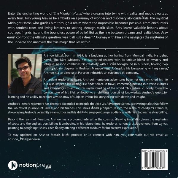 Enter the enchanting world of 'The Midnight Horse, ' where dreams intertwine with reality and magic awaits at every turn. Join young Arav as he embarks on a journey of wonder and discovery alongside Kala, the mystical Midnight Horse, who guides him through a realm where the impossible becomes possible. From encounters with sentient trees and living lanterns to soaring through starlit skies, Arav learns valuable lessons about courage, friendship, and the boundless power of belief. But as the line between dreams and reality blurs, Arav must confront the ultimate question: was it all just a dream? Journey with him as he navigates the mysteries of the universe and uncovers the true magic that lies within.