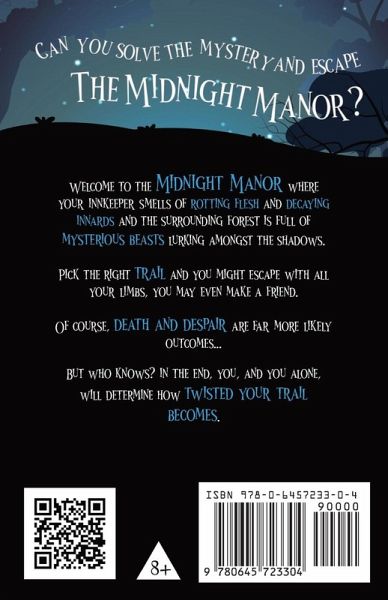 Ages 8 - 12. Interactive Adventures. 10 possible endings. 17 potential trails. Can you solve the mystery and escape The Midnight Manor? When you and your mum are forced to stop driving and face the mysterious fog that has devoured the road ahead, you are faced with your first twist in your path! Will you hop out of the car and seek sanctuary at the eerie Midnight Manor? Or will you bunker down in the car and let your mum investigate on her own? This is just one of many forks in the road, where you must choose your path! What readers are saying about this book: "10/10! If I had a book club, I would definitely recommend this book!" - 9 year old "It's so mysterious, it's MIST-ERIOUS! I love it!" - 9 year old "Awesome book, super fun to read!" - 10 year old "Spook-tastic! The narrator creates an intimate reading experience, as she escorts the reader every step of the way through a myriad of twists and turns, allowing the reader to become the protagonist and drive the story in their chosen direction. I had so much fun!' Will you end up a midnight snack for a hungry night howler? Or perhaps you'll join the ranks of resident walking dead? There is always the possibility that you will escape with all of your limbs in tact... but really.. where's the fun in that? In the end, you, and you alone will determine how twisted your trail becomes. Welcome, to the Midnight Manor.