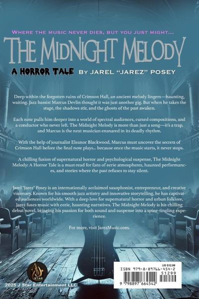 The Midnight Melody follows jazz bassist Marcus Devlin, who is lured to the abandoned Crimson Hall, only to discover that his music awakens a cursed melody and a ghostly audience.
