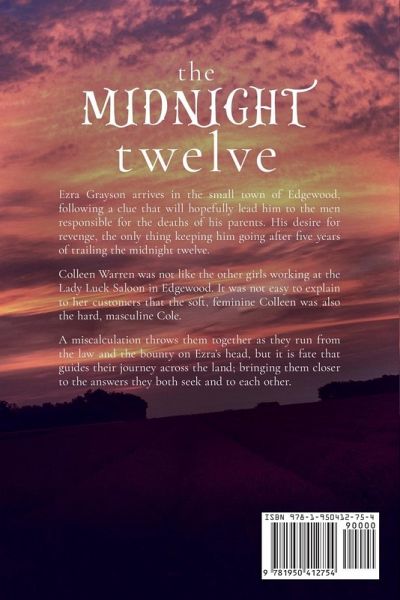 Ezra Grayson arrives in the small town of Edgewood, following a clue that will hopefully lead him to the men responsible for the deaths of his parents. His desire for revenge, the only thing keeping him going after five years of trailing the midnight twelve. Colleen Warren was not like the other girls working at the Lady Luck Saloon in Edgewood. It was not easy to explain to her customers that the soft, feminine Colleen was also the hard, masculine Cole. A miscalculation throws them together as they run from the law and the bounty on Ezra’s head, but it is fate that guides their journey across the land; bringing them closer to the answers they both seek and to each other.