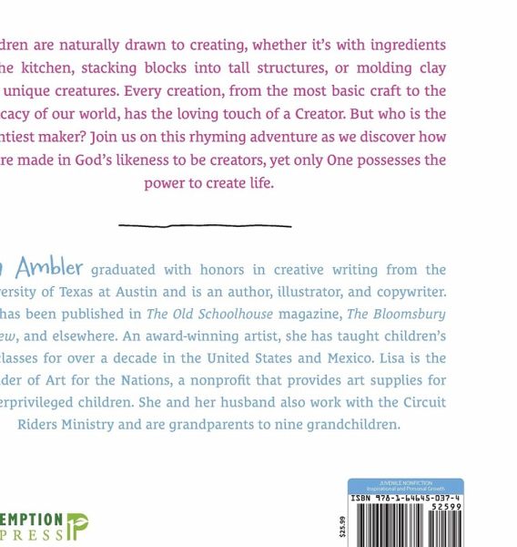 Children are naturally drawn to creating, whether it's with ingredients in the kitchen, stacking blocks into tall structures, or molding clay into unique creatures. Every creation, from the most basic craft to the intricacy of our world, has the loving touch of a Creator. But who is the mightiest maker? Join us on this rhyming adventure as we discover how we are made in God's likeness to be creators, yet only One possesses the power to create life.
