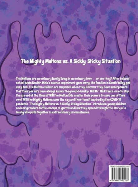 The Meltons are an ordinary family living in an ordinary town ... or are they? After beloved school custodian Mr. Mink's science experiment goes awry, the families in South Valley get very sick, and the Melton children are surprised when they discover they have superpowers. and that their parents have always known they would develop. Will Mr. Mink find a cure to stop the spread of the illness? Will the Melton kids master their powers to save one of their own? Will the Mighty Meltons save the day and their town? Inspired by the COVID-19 pandemic, "The Mighty Meltons vs. A Sickly, Sticky Situation," introduces young children and early readers to the concept of germs and how they spread through the story of a family who pulls together in extraordinary circumstances.
