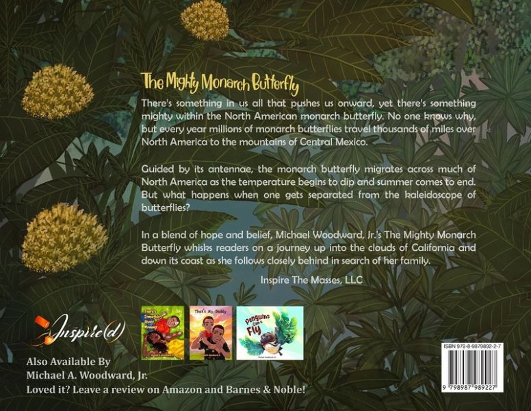The Mighty Monarch Butterfly There's something in us all that pushes us onward, yet there's something mighty within the North American monarch butterfly. No one knows why, but every year millions of monarch butterflies travel thousands of miles over North America to the mountains of Central Mexico. Guided by its antennae, the monarch butterfly migrates across much of North America as the temperature begins to dip and summer comes to end. But what happens when one gets separated from the kaleidoscope of butterflies? In a blend of hope and belief, Michael Woodward, Jr.'s The Mighty Monarch Butterfly whisks readers on a journey up into the clouds of California and down its coast as she follows closely behind in search of her family.