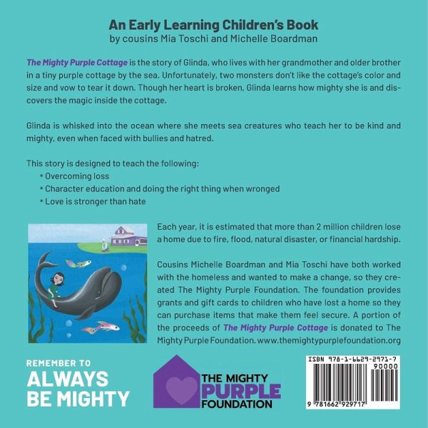 The Mighty Purple Cottage tells the story of a 6-year-old named Glinda. Glinda lives in a magical home with her Grandmother and older brother, Stevo. However, two monsters want to take away their beautiful home because it is not as large and grandiose as the other homes. The monsters represent anything that can take a child's home......fire, floods, or natural disasters. Each year, it is estimated 250,000 children lose a home and a home represents security. Eventually, Glinda is whisked into the sea where she meets a fancy octopus, a whale, and a school of fishes - all of whom share advice. When she comes back from her visit, the cottage is gone and a beautiful mermaid appears and tells Glinda to "Always see the best and beauty in life and you will be mighty like the cottage." She suggests to Glinda that she plant purple flowers in honor of her home and all the children who have lost homes. The Mighty Purple Cottage also has a foundation, The Mighty Purple Foundation. Each year, three children who have lost homes, are awarded $500 to purchase items that make them feel secure.