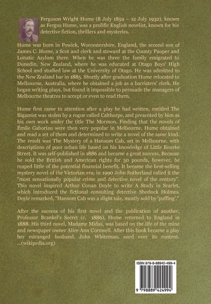 A murder mystery by Ferguson Hume About the author Ferguson Wright Hume (8 July 1859 - 12 July 1932), known as Fergus Hume, was a prolific English novelist, known for his detective fiction, thrillers and mysteries. Hume was born in Powick, Worcestershire, England, the second son of James C. Hume, a Scot and clerk and steward at the County Pauper and Lunatic Asylum there. When he was three the family emigrated to Dunedin, New Zealand, where he was educated at Otago Boys' High School and studied law at the University of Otago. He was admitted to the New Zealand bar in 1885. Shortly after graduation Hume relocated to Melbourne, Australia, where he obtained a job as a barristers' clerk. He began writing plays, but found it impossible to persuade the managers of Melbourne theatres to accept or even to read them. Hume first came to attention after a play he had written, entitled The Bigamist was stolen by a rogue called Calthorpe, and presented by him as his own work under the title The Mormon. Finding that the novels of Émile Gaboriau were then very popular in Melbourne, Hume obtained and read a set of them and determined to write a novel of the same kind. The result was The Mystery of a Hansom Cab, set in Melbourne, with descriptions of poor urban life based on his knowledge of Little Bourke Street. It was self-published in 1886 and became a great success. Because he sold the British and American rights for 50 pounds, however, he reaped little of the potential financial benefit. It became the best-selling mystery novel of the Victorian era; in 1990 John Sutherland called it the "most sensationally popular crime and detective novel of the century". This novel inspired Arthur Conan Doyle to write A Study in Scarlet, which introduced the fictional consulting detective Sherlock Holmes. Doyle remarked, "Hansom Cab was a slight tale, mostly sold by 'puffing'." After the success of his first novel and the publication of another, Professor Brankel's Secret (c. 1886), Hume returned to England in 1888. His third novel, Madame Midas, was based on the life of the mine and newspaper owner Alice Ann Cornwell. After this book became a play her estranged husband, John Whiteman, sued over its content. ...(wikipedia.org)