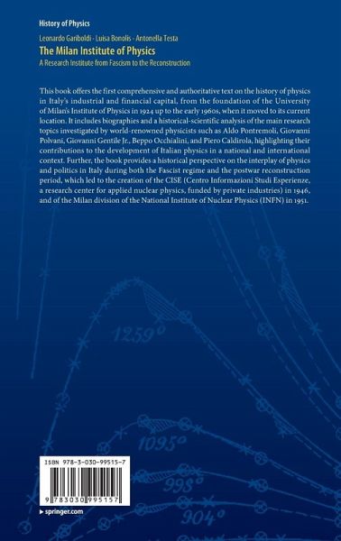 Physics in Milan before the foundation of the University of Milan.- The Institute of Complementary Physics: Aldo Pontremoli and the 1928 polar expedition.- The Institute of Physics in 1930-45: Giovanni Polvani, the impact of Fascism and the war on the physics community.- Giovanni Gentile jr and the intermediate statistics.- The post-war reconstruction of the Institute of Physics.- Cosmic-ray physics: from Giuseppe Cocconi's cloud chambers to Beppo Occhialini's nuclear emulsions.- Nuclear physics: the collaboration with the C.I.S.E. (Centro Informazioni Studi Esperienze) and the I.N.F.N. (National Institute of Nuclear Physics).- Theoretical physics: the contributions by Piero Caldirola and his school.