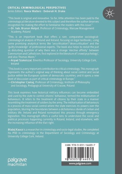 This book examines how historical military influences can become embedded and used by the state to control citizens' behaviour, termed the militarisation of behaviours. It refers to the treatment of citizens by their state in a manner resembling the treatment of soldiers by the army. The militarisation of behaviours is a process of mass social control where the state exercises its powers over the population, blurring the boundaries between a dichotomous divide of civilian and military life. This book focuses on the social process of how Polish post-WWII emergency legislation was normalised and how through it the Polish communist state (from 1943/4 until 1989) introduced and enforced the process of militarisation of behaviours. It discusses the impact of the emergency legislation on the Republic of Ireland as a comparison. It offers a useful lens to understand the social and political processes happening currently in Poland, Ireland, and elsewhere, with the increasing influence ofthe (far) right. This book is situated in the framework of criminology and socio-legal studies.