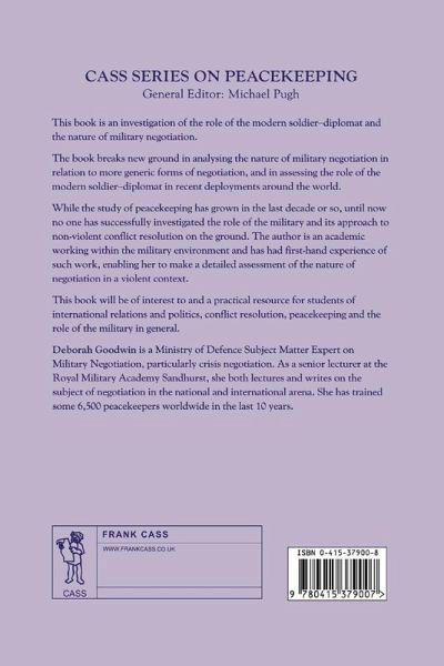 This is an investigation of the role of the modern soldier/diplomat and the nature of military negotiation, in comparison with negotiation in other contexts. It is a detailed analysis of the role of the military in current operations as negotiators and liaison workers in the field. Very few in the academic world are writing on this specific role of the military and the nature of negotiation in this situation, and such a volatile context. This publication is a first in this context, and has a keen audience in light of the current world order. The book is breaking new ground in analysing the nature of military negotiation in relation to more generic forms of negotiation, and assessing the role of the modern soldier/diplomat in recent deployments around the world. The author is an academic working within the military environment, very few people have the same capacity and accessibility to firsthand evidence and observation. Whilst peacekeeping has grown in the last decade or so, no-one has successfully investigated the role of the military and their approach to non-violent conflict resolution on the ground as few have access to such work to make a viable detailed assessment of the nature of negotiation in a violent context, but Dr Goodwin is able to do so.